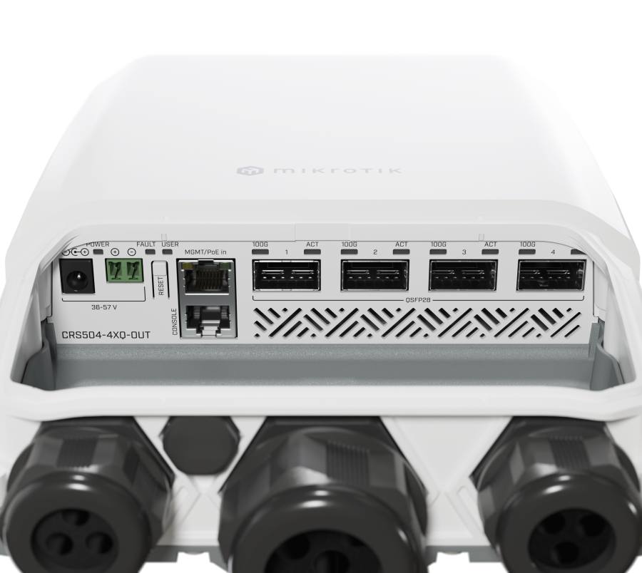 The MikroTik CRS504-4XQ-OUT is a high-speed and energy-efficient 100 Gigabit network switch designed for outdoor use. Its robust housing, certified IP66, makes it resistant to harsh weather conditions. This device is ideal for data centers, ISPs, and outdoor applications requiring high bandwidth.