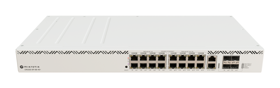 MikroTik CRS320-8P-8B-4S+RM, yüksek güçlü PoE++ (802.3bt) desteği sunan, 17 Gigabit Ethernet portu ve 4 adet 10G SFP+ fiber uplink portuna sahip gelişmiş bir Layer 3 yönetilebilir switch'tir. Bu cihaz, özellikle oteller, ofisler, konferans salonları ve yüksek katlı binalar gibi yüksek güç gereksinimi olan ortamlarda kullanılmak üzere tasarlanmıştır.